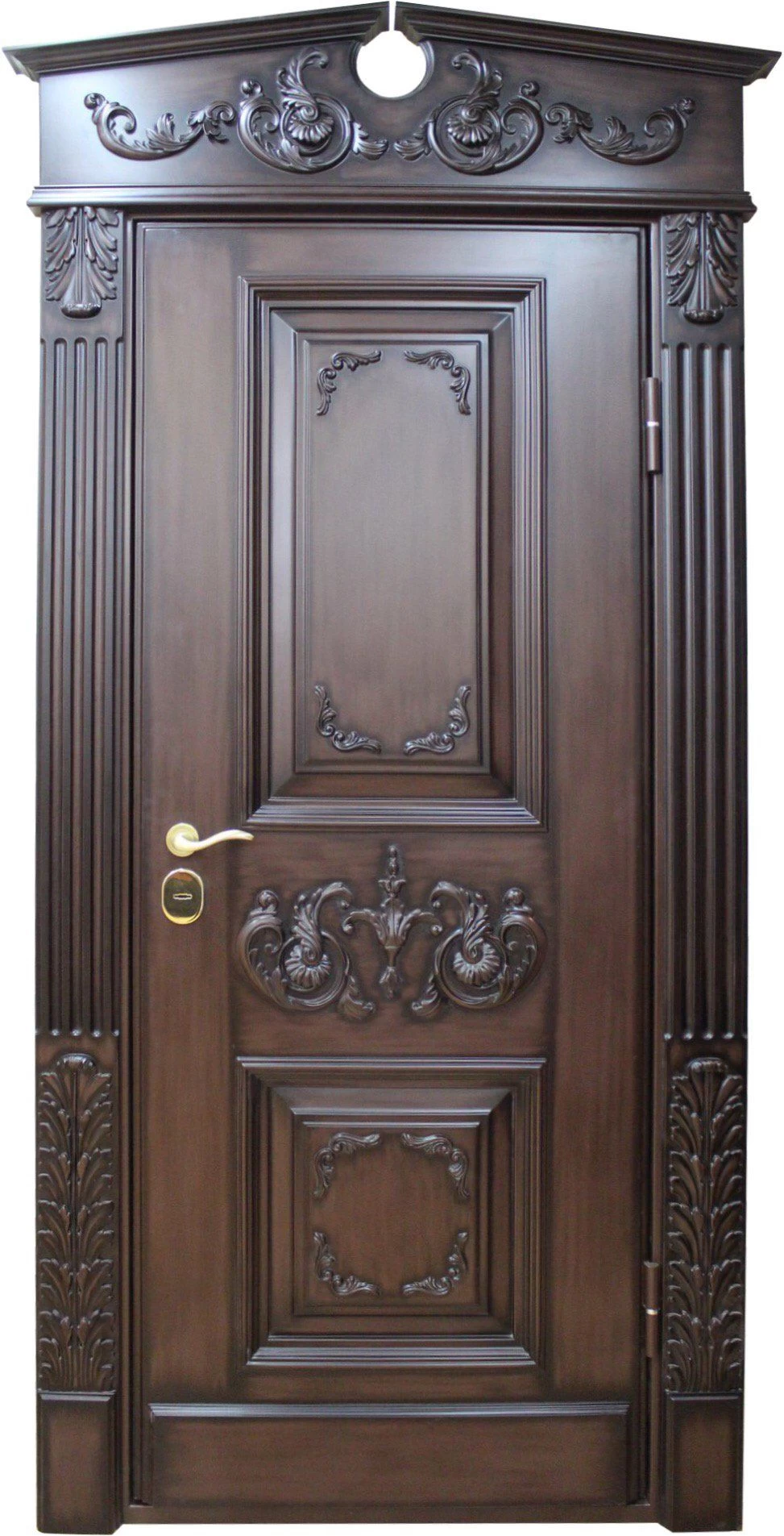 Поговорим об отделке. Вариантов декора дверей много. В большинстве случаев, для отделки элитных дверей используется массив натурального дерева или натуральный шпон с фрезеровкой. Цвет двери так же делается по желанию заказчика. Очень красиво и представительно выглядят двери с ковкой и стеклом.